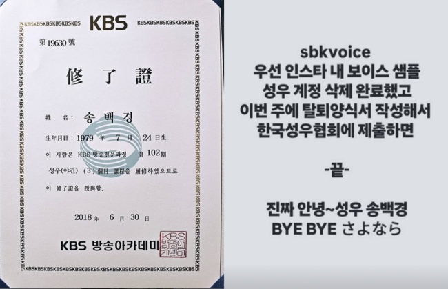 18일 송백경은 자신의 소셜 계정에 "우선 인스타 내 보이스 샘플 성우 계정 삭제 완료했고 이번주에 탈퇴양식서 작성해서 한국성우협회에 제출하면 끝"이라며 "진짜 안녕~ 성우 송백경"이라고 성우를 그만두기 위한 절차를 밟고 있는 근황을 전했다.