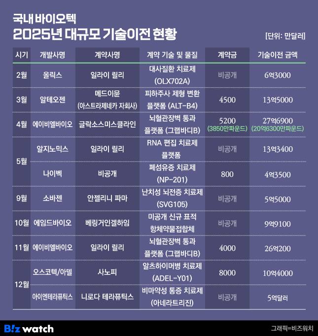 기술이전 사례를 보면 일라이 릴리는 올해 올릭스, 에이비엘바이오, 알지노믹스 3개 기업의 기술을 연달아 도입했다. 비만치료제 '마운자로'를 보유한 글로벌 탑티어 제약사인 일라이 릴리가 한국 기업과 기술을 선택했다는 점이 주목할 만하다.