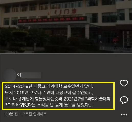 하지만 주사이모 A씨는 18일에도 자신이 내몽고의과대학 교수라는 주장을 굽히지 않고 있다. "2014년부터 2019년까지 의과대학 교수였다"며 개인 SNS에 올렸다.
