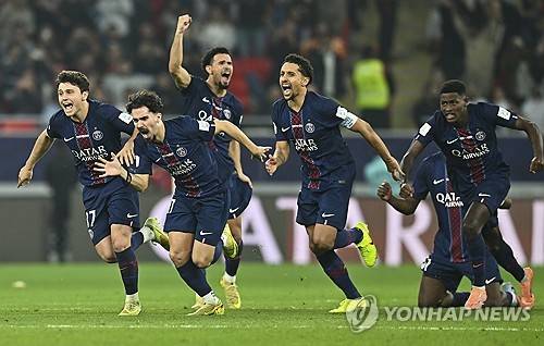 epaselect epa12599666 Paris Saint-Germain players celebrate winning the penalty shoot out during the FIFA Intercontinental Cup 2025 match between Paris Saint-Germain and CR Flamengo at Ahmad Bin Ali Stadium in Al-Rayyan, Qatar, 17 December 2025. EPA/NOUSHAD THEKKAYIL