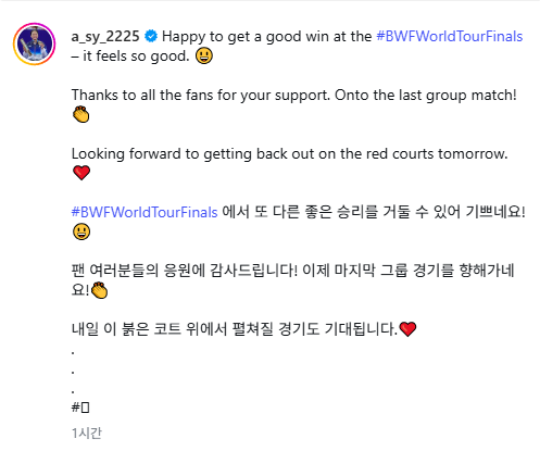 안세영은 여러 장의 경기 사진과 함께 "BWF 월드투어 파이널에서 또 다른 좋은 승리를 거둘 수 있어 기쁘네요!"라며 "팬 여러분들의 응원에 감사드립니다! 이제 마지막 그룹 경기를 향해가네요!"라고 썼다.
