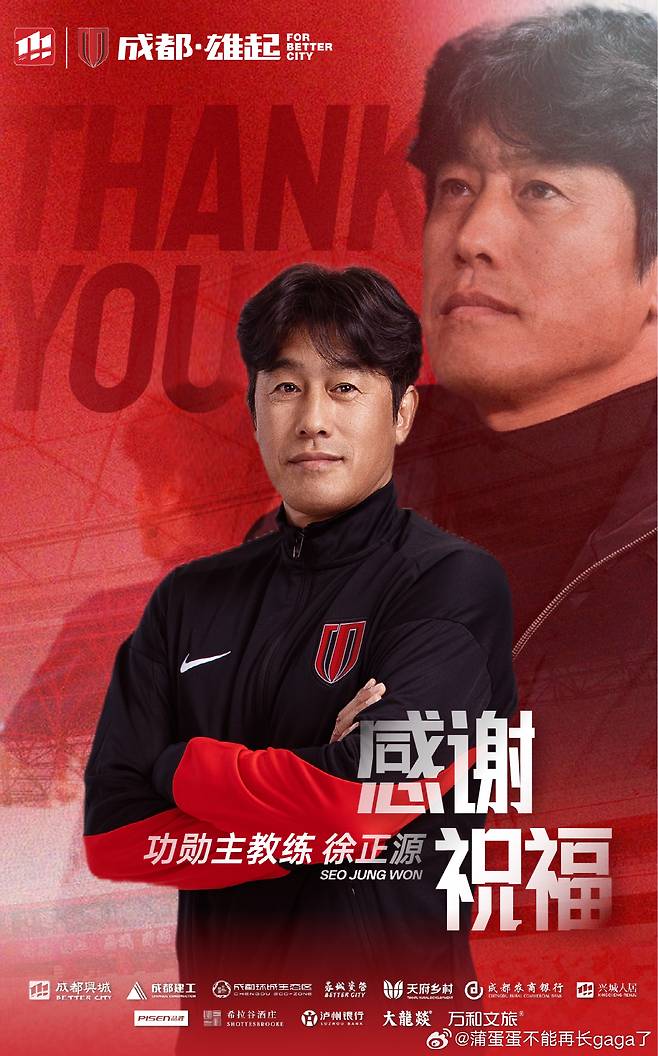 청두 구단은 18일 공식 채널을 통해 서 감독과 '우호적인 협의 끝에' 계약 연장을 맺지 않기로 했다고 공식 발표했다. 동시에 구단은 서정원 감독의 공로를 인정해 '청두 클럽 공로 감독상'을 수여하기로 했다고 덧붙였다.