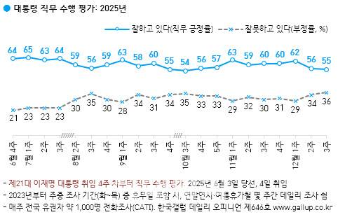 李대통령 지지율 55%...전주대비 1%p 하락[한국갤럽]