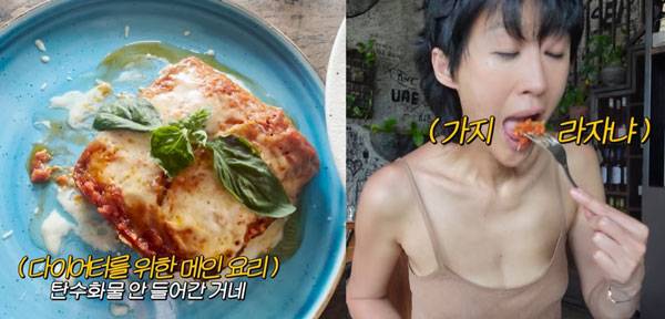 식사의 첫 번째 코스 메뉴가 나오자 홍진경의 지인이 "이게 라자냐처럼 생겼는데, '파르미지아나'라고 해서 면 대신 가지로 한 거다"고 말했고, 이에 홍진경은 "그럼 탄수화물이 안 들어간 거네"라고 말했다.