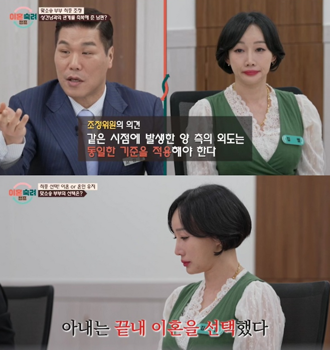 마지막으로 '맞소송 부부'의 최종 조정이 공개됐다. 남편 측은 아내가 SNS에서 남편을 험담하고 외도까지 한 만큼 아내에게도 책임이 있다며, 양측 모두 위자료 청구는 불가하다고 주장했다.