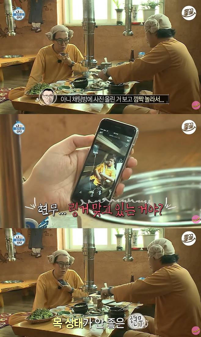 이 가운데 전현무는 김영철에게 차량 안에서 링거를 맞고 있는 것처럼 보이는 사진을 단체 채팅방에 공유했다. 이를 본 김영철이 놀라 전화를 걸자 전현무는 "목 상태가 좋지 않다"고 설명했다.