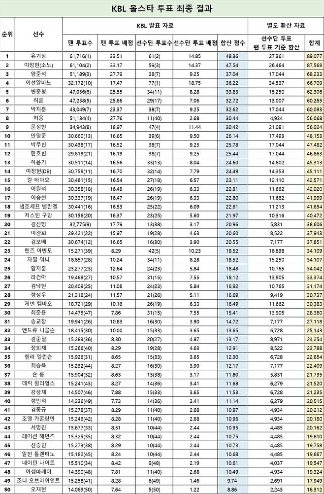 KBL은 18일 올스타 투표 결과를 발표했다. 지난 시즌부터 올스타 투표는 팬과 선수 투표로 진행된다. 비율은 7대 3으로 팬 투표에 더 많은 비중을 둔다.