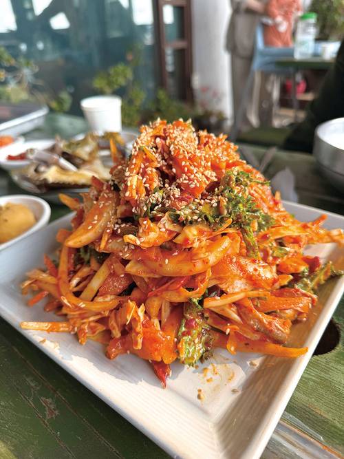 또 다른 인기 메뉴는 밴댕이회무침 정식이다. 강화도의 특산물인 밴댕이를 새콤달콤하게 무쳐내어 입맛을 돋우며, 밥에 비벼 먹으면 밥도둑이 따로 없다. 밥은 솥밥으로 나오고 된장찌개가 함께 제공된다. 석모도 보문사 입구 바로 맞은편에 위치해 있어 보문사를 들르기 전후 방문하기 좋으며, 2층 테라스에서 갯벌 풍경을 즐길 수 있는 뷰 맛집이기도 하다.