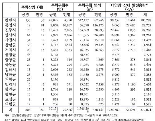 | ▲ 주차구획 50면이상 주차장(공영+민영) 태양광 잠재 발전용량*(2024년 경남 시군별) |