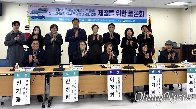 토론회는 이경희 경남기후위기비상행동 운영위원이 좌장을 맡아 진행되었다. 박기남 충남기후에너지시민재단 상임이사는 발제를 통해 경기도와 충남도 조례안을 소개하면서 "공공주차장 태양광 의무화는 전국으로 확산되고 있다"라고 밝혔다. 충남은 올해 2월 충남시민햇빛발전 1·2호기를 준공했고, 4월부터 3·4호기 협의를 했다.