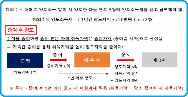 양도소득세를 줄일 수 있는 방안은 없을까? 우선 증여 후 양도를 고려할 수 있다. 주식을 증여하면 증여받은 자의 취득가액은 증여일 시가인 증여가액으로 산정된다. 따라서 가족간 증여를 통해 취득가액을 높여 양도차익을 줄일 수 있다. 단 기억할 것은 증여 후 1년 이내에 양도 시 이월과세가 적용되어 취득가액이 당초 증여한 자의 취득가액이 됨은 주의하자.