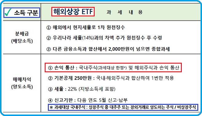 해외상장 ETF는 국내 세법상 해외주식과 동일하게 취급된다. 미국, 유럽 등 해외거래소에 직접 투자하는 방식으로, 해외주식과 마찬가지로 연간 발생하는 해외주식과 해외상장 ETF, 그리고 과세대상이 되는 국내주식 등의 양도소득은 모두 합산하되 250만 원까지는 비과세 혜택이 적용된다. 때문에 250만 원을 초과하는 금액에 대해서만 22%의 세율이 적용된다. 과세대상이 되는 국내주식이란 상장주식 중 대주주가 양도하는 주식과 비상장 주식을 말한다.
