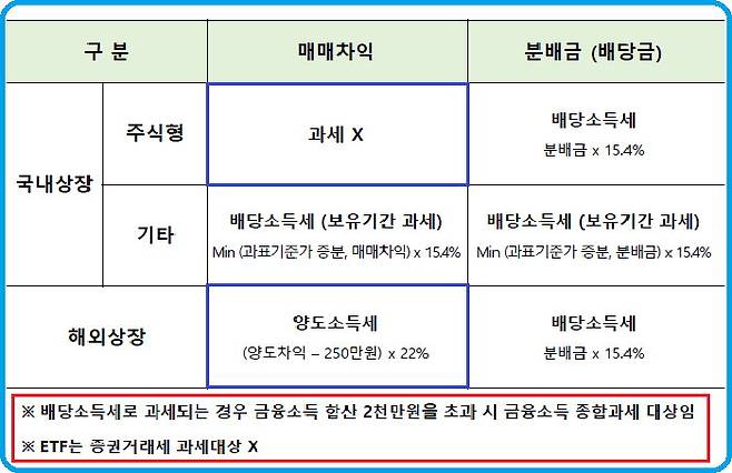 ‘양도소득세’는 금융소득종합과세 대상에 포함되지 않고 별도로 분리하여 분류과세 되는 세금이다. 보유 시 발행하는 분배금에 대해서는 국내주식형 ETF를 포함해서 모든 국내상장 ETF에 대해 배당소득세 15.4%가 과세된다. 해외에 상장된 해외 상장 ETF에 대해서도 역시 15.4% 배당소득세가 과세되고 모두 금융소득종합과세 대상이 된다는 것을 기억할 필요가 있다.