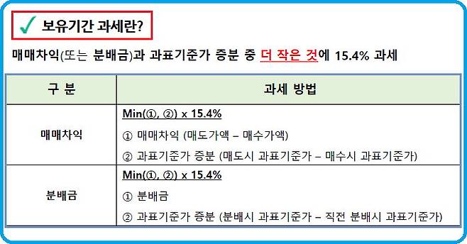 ‘보유기간과세’란 매매차익에 있어서는 매매차익과 과표기준가 증분 중 더 작은 것에, 분배금에 있어서는 분배금과 과표기준가 증분 중 더 작은 것에 배당소득세 15.4%를 과세하는 것을 말한다. 해외상장 ETF의 경우에도 분배금에 있어서는 배당소득세가 과세됨을 기억하자. ETF는 법적으로 펀드(수익증권)에 가깝기 때문에, 주식매매 시 부과되는 증권거래세는 대부분 면제된다. 때문에 세금측면에서 매매를 통한 거래 시 유리하다.