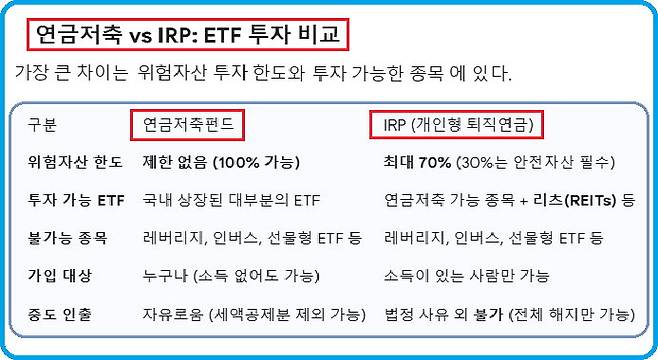 다만 IRP에서 투자를 이어갈 경우 위험자산 투자한도를 살펴야 한다. IRP가입자는 적립금 중 70%까지만 위험자산에 투자할 수 있다. 주식비중이 50%이상인 펀드와 ETF, 하이일드 채권펀드, 리츠 등이 위험자산에 포함된다. 나머지 30%는 원리금 보장상품, 주식비중이 50%미만인 펀드와 ETF 혹은 적격TDF나 디폴트옵션 상품에 투자해야 한다. 연금저축펀드 가입자는 이와 같은 위험자산 투자한도를 적용받지 않고 투자할 수 있다.