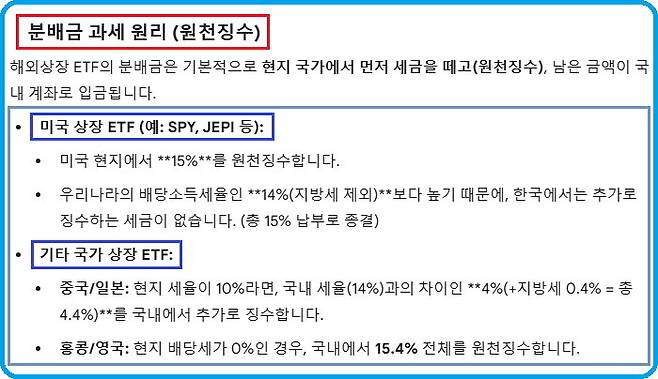 즉 해외상장 ETF에서 받는 분배금은 세법상 배당소득으로 분류된다. 일반적으로 지방소득세를 포함하여 15.4%의 세율로 과세된다. 보통 투자자가 ETF에 투자한 국가에서 먼저 현지환율로 원천징수된다. 이후 한국에서 다시 과세할 때에는 외국납부세액공제가 적용된다. 예를 들어 미국과 같이 소득세 기준 원천징수세율이 15%로 현지 세율이 한국의 배당소득세율인 14%보다 높은 경우에는 추가 과세되지 않으며, 낮은 경우 그 차액만큼만 추가 과세되는 구조다. 이때 분배금은 원천징수 되기 때문에 투자자가 별도로 신고할 필요는 없다.