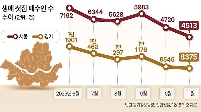 경기도의 생애 첫 매수자 수 또한 10월 9546명에서 11월 8375명으로 12.3% 감소했다. 11월 기준으로는 1년 전(9348명)보다 적은 수치다.