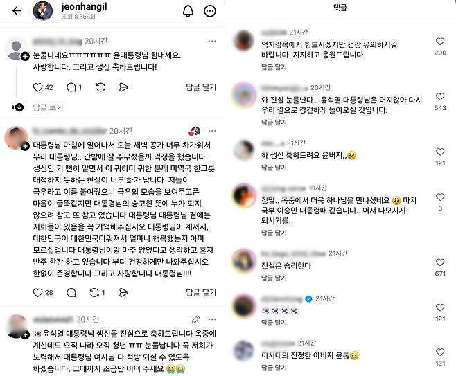 | ▲ 18일 윤석열씨가 옥중에서 낸 비상계엄을 옹호하는 메시지가 SNS를 통해 지지자들 사이에서 공유되며 응원 댓글이 달리고 있다. 왼쪽은 전한길씨가 '스레드'를 통해 공유한 윤석열 메시지의 응원댓글, 오른쪽은 극우 청년단체 자유대학이 인스타그램을 통해 공유한 윤석열 메시지의 응원댓글 |