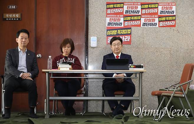 | ▲ 김문수-한덕수 단일화 촉구 단식 나선 권성동·최은석·김미애, 국민의힘 권성동 원내대표와 김미애(부산 해운대구을) 의원이 5월 8일 오전 서울 여의도 국회 원내대표실 앞에서 김문수 대선 예비후보와 한덕수 무소속 대선 예비후보와의 단일화를 촉구하며 단식농성을 하고 있다. 왼쪽은 농성장을 방문한 최은석(대구 동구군위군갑, 왼쪽) 의원. 당시 권성동 원내대표 비서실장을 맡았다. |