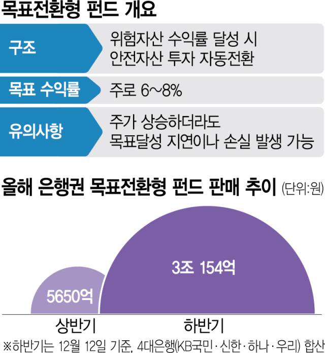 19일 금융계에 따르면 4대 은행(KB국민·신한·하나·우리)의 올해 목표전환형 펀드 판매액은 이달 12일 기준 3조 5804억 원으로 집계됐다. 올 상반기 판매액은 5650억 원에 그쳤지만 하반기에는 주식시장 호황에 힘입어 3조 원이 넘는 뭉칫돈이 몰렸다.