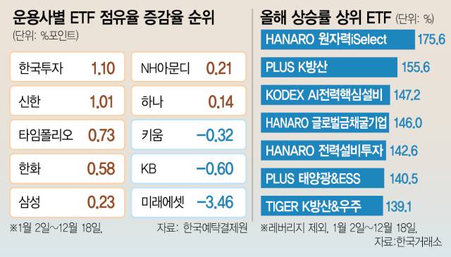 ETF 시장 점유율이 가장 큰 폭으로 늘어난 곳은 한국투자신탁운용이다. 지난해 말 7.56%에서 이달 18일 8.66%로 1.10%포인트 확대돼 KB자산운용을 제치고 3위 자리를 굳혔다. 신한자산운용도 점유율이 3.13%에서 4.14%로 1.01%포인트 늘어나면서 못지않은 성과를 냈다. 두 회사 대표 상품인 ‘ACE KRX금현물’, ‘SOL 조선TOP3플러스’ 등이 투자금을 끌어 모으면서 효자 노릇을 했다. 타임폴리오자산운용도 0.55%에서 1.28%까지 0.73%포인트 늘리며 점유율 순위가 10위에서 8위로 두 계단 올라섰다.