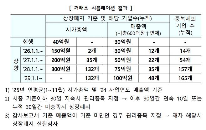 시가총액 상장폐지 요건도 1월부터 확대된다. 시총이 현 40억원에서 단계적으로 150억원 미만이면 상폐 요건에 해당하게 된다. 시뮬레이션 결과 내년 14개사가 상장폐지 요건에 해당하지만 기준 상향조정이 마무리되는 2029년은 코스닥 상장기업의 9.5%인 165개가 상폐 요건에 해당하게 된다.