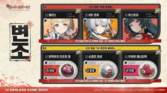 복각으로는 독점 재개봉 채널로 앨리스, 0호 엔비, 아스트라가 등장한다. 새로운 채널인 독점 재개봉은 첫 10연차 20% 할인, 선택한 S급을 처음으로 확정 획득할 수 있는 만큼 해당 캐릭터를 뽑을 계획이 있다면 이전보다 편하게 뽑을 수 있을 것이다. 누적 변조 데이터는 다음 독점 재개봉 채널에 계승되고 다른 채널과 별개로 계산된다.