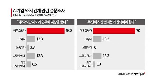 아시아경제가 지난 8~12일 서울 양재 AI특구 기업들을 대상으로 주52시간 근무제에 대한 인식을 조사한 결과 응답한 30개 기업 가운데 24곳(80%)이 현행 주52시간제로 인해 업무에 차질을 빚고 있다고 답했다. 지장이 없다고 답한 기업은 6곳(20%)에 불과했다.