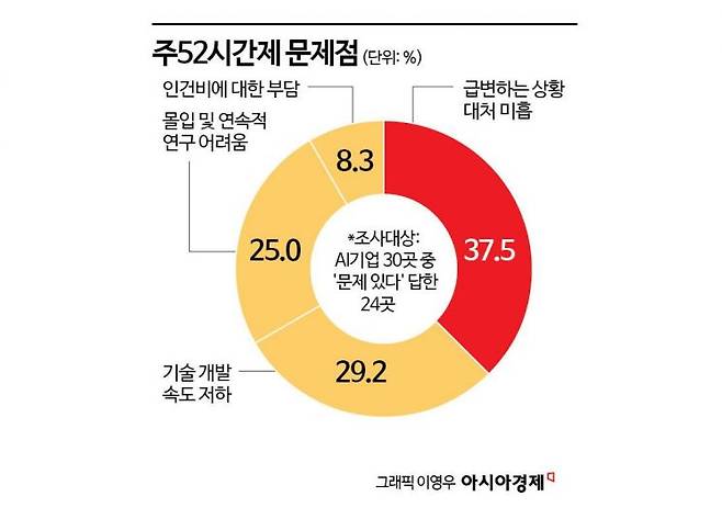 반면, 52시간제가 크게 문제가 되지 않는다고 답변한 기업들은 그 이유로 '충분한 인력 보유'(50%)를 가장 많이 꼽았다. 익명을 요구한 AI 관계자는 "초과근로 관련 추가 임금을 지급하고 있으면서도 기술력이 생존의 최우선이 돼야 하는 스타트업은 상당한 부담과 책임 의식을 느낀다"고 말했다. 또 다른 관계자는 "자발적으로 근무 시간을 신경 쓰지 않고 연구에 몰입하려는 구성원들도 법이 허용하는 근무시간 때문에 의지가 꺾이는 경우를 많이 봤다"고 설명했다.