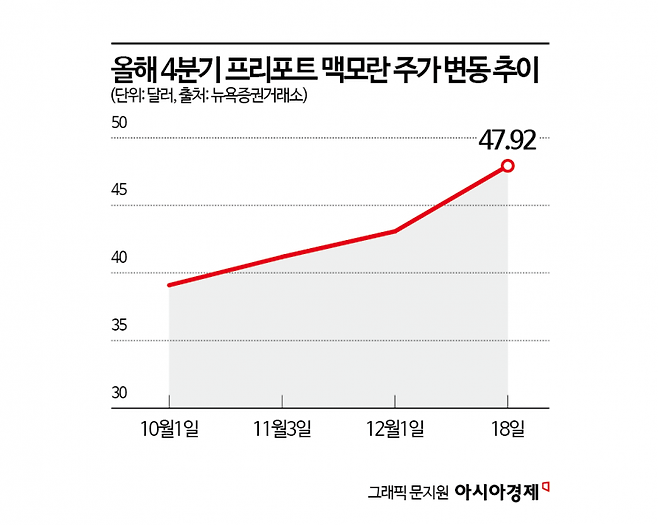 뉴욕증권거래소(NYSE)에서 프리포트맥모란의 주가는 18일(현지시간) 47.92달러를 기록했다. 올해 4분기(10~12월) 동안 22.58% 상승했다. AI거품론 등 미국 증시 조정 분위기 속에 S&P500 지수가 4분기동안 0.94% 오른 것을 고려하면 상대적으로 강한 상승세를 보인 셈이다.
