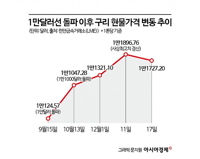 영국 런던금속거래소(LME)에서 17일 구리 현물가격은 1t당 1만1727.20달러를 기록했다. 구리가격은 지난 9월15일 1만124.57달러로 1만달러선을 돌파한 이후 지난 11일에는 1만1896.76달러까지 올라 최고치를 다시 경신했다. 이후에도 1만1700~1만1800달러선에서 고공행진 중이다.