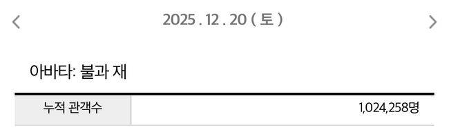 영화관입장권 통합전산망에 따르면 '아바타: 불과 재'는 12월 20일(토) 오전 6시 기준, 1,024,258명의 누적 관객수를 동원하며 100만 관객 돌파를 알렸다.