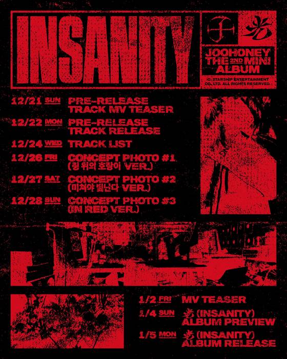 스타쉽엔터테인먼트는 지난 19일 몬스타엑스 공식 SNS 채널을 통해 주헌의 미니 2집 '光 (INSANITY)' 앨범 스케줄러를 공개했다. 레드와 블랙 톤의 빈티지 포스터 형태로 제작된 해당 스케줄러는 다양한 티징 콘텐트 일정으로 기대감을 더한 것은 물론, 복싱 경기장을 연상케 하는 감각적인 디자인으로 눈길을 끌었다.