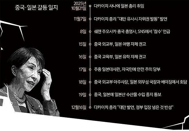 중국은 최근 일본과의 마찰에서도 ‘한일령’ 등으로 수위를 조절해 가며 공세에 나섰다. 다카이치 사나에 일본 총리가 대만 유사시 자위대의 개입 가능성을 언급하자 중국은 외교 경로와 국제무대를 통해 압박 강도를 끌어올렸다. 이후 다카이치 총리는 발언 자체를 철회하지는 않았지만 “정부 입장을 넘은 것으로 받아들여진 점을 반성한다”며 수위를 낮췄고, 대만 관련 언급을 자제하는 태도로 돌아섰다.
