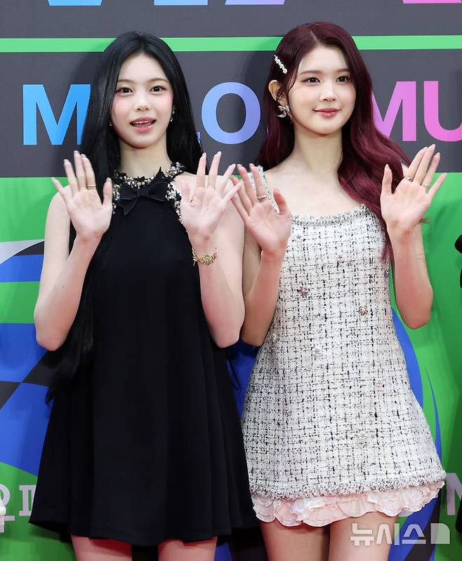 [서울=뉴시스] 김혜진 기자 = 그룹 하츠투하츠 이안(왼쪽), 에이나가 20일 오후 서울 구로구 고척스카이돔에서 열린 2025 멜론뮤직어워드(MMA2025) 레드카펫을 밟고 있다.