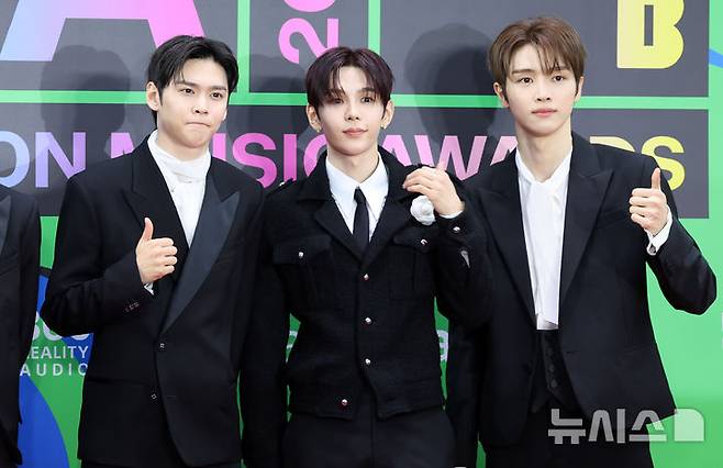 [서울=뉴시스] 김혜진 기자 = 그룹 라이즈 은석(왼쪽부터), 쇼타로, 성찬이 20일 오후 서울 구로구 고척스카이돔에서 열린 2025 멜론뮤직어워드(MMA2025) 레드카펫을 밟고 있다.