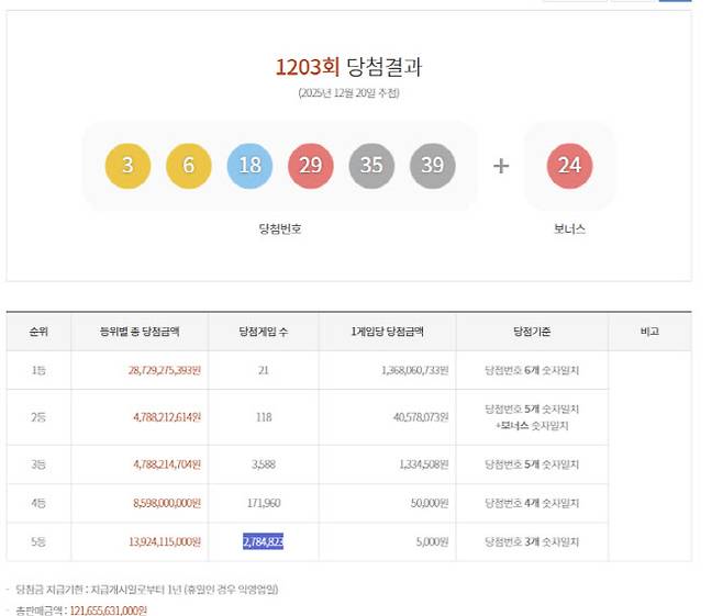 제1203회 로또복권 추첨에서 1등 당첨자가 21명 나왔다.
