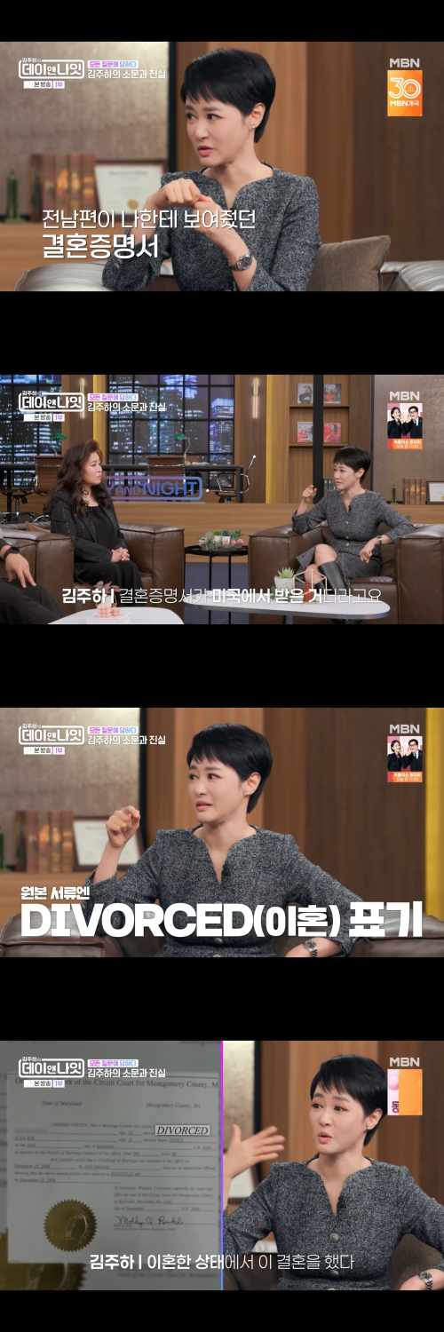 이어 그는 결혼 생활 중 우연히 마주한 충격적인 진실을 고백했다. 김주하는 “아이를 낳고 친정 근처로 이사하면서 짐 정리를 하다 시어머니 방 옷장에서 서류 상자를 발견했다”며 “미국에서 발급된 결혼증명서 원본에 ‘디보스(divorce)’라고 적혀 있었다. 결혼한 상태에서 또 다른 결혼을 했다는 의미였다”고 설명했다.
