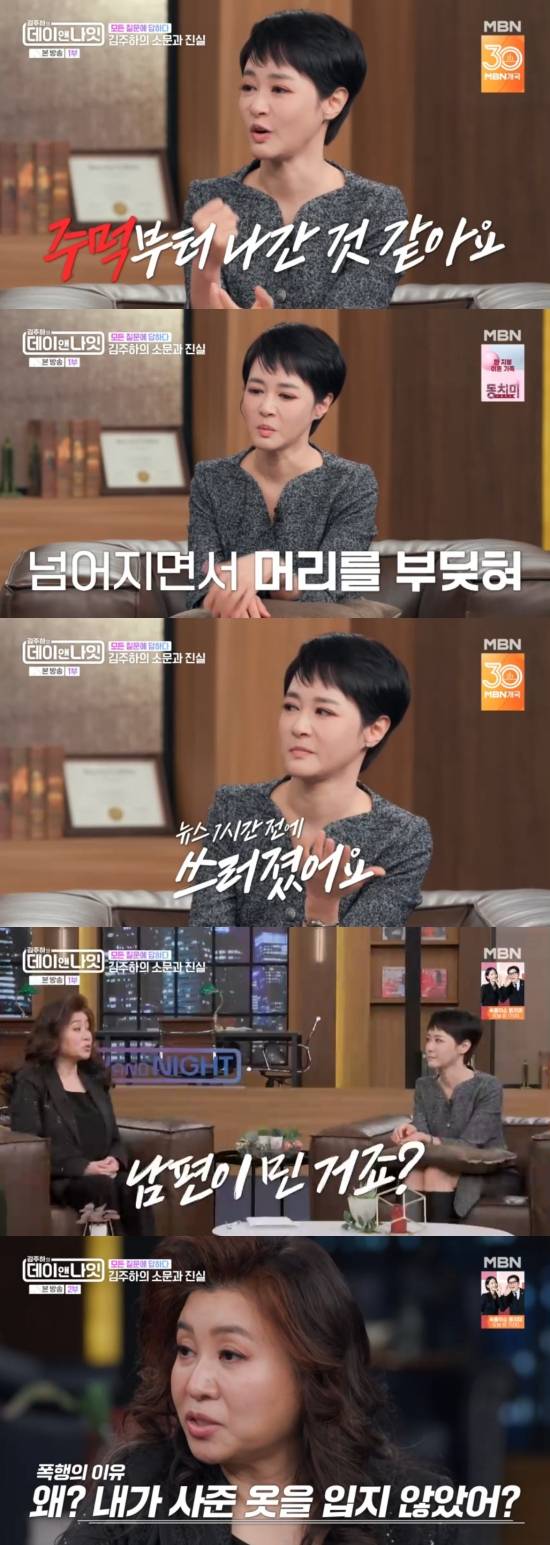 전 남편의 악행은 이게 끝이 아니었다. 김주하는 "외도는 계속됐다. 집에 일찍 들어오는 시간이 새벽 3,4시고 출장도 속이고 간다. 문제는 여권을 보면 기간이 나와있으니까 외도 사실을 알게 되는 거다. 눈으로 본 걸 이야기했을 때 할 말이 없으면 주먹부터 나왔다"고 털어놨다.