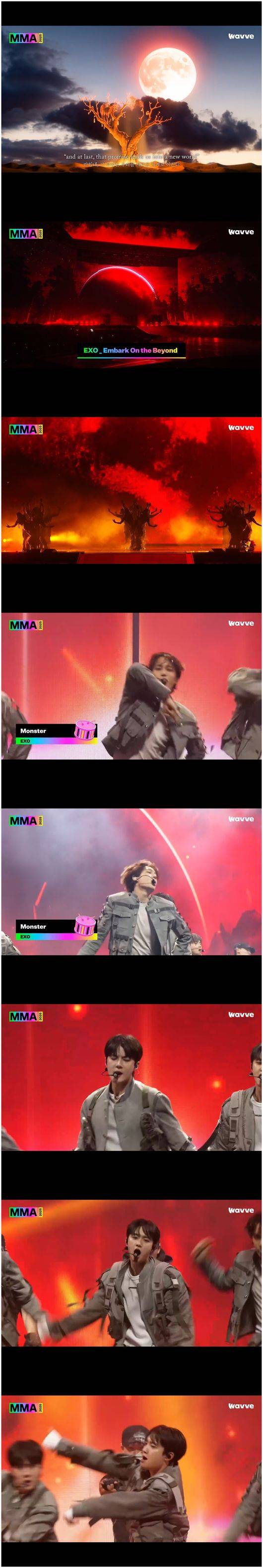 이런 엑소의 행보는 묵묵하게 내년 1월 정규 8집 앨범 발매를 알렸다. 진심은 요란하지 않는 법이며 행동으로 보이는 걸 증명하는 순간이었다. 갑작스럽게 알려진 MMA 행사에서 엑소는 올해 낸 곡 하나 없어도 본 무대 후반부에 등장하며 시선을 끌었다. 오랜 팬들이라면 익히 마음이 뜨거워질 '생명의 나무' VCR을 시작으로, '늑대와 미녀' 인트로로 무대를 연 엑소는 '몬스터' 무대를 이어나갔다.