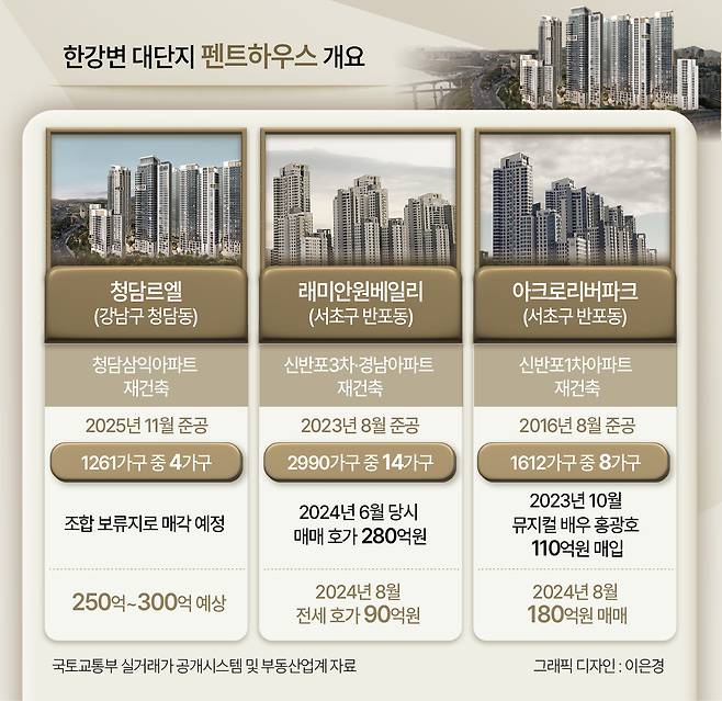 4가구 모두 각 동 최고층인 35층에 배치돼 있으며, 전 가구가 한강 조망과 테라스를 갖추고 있다. 펜트 타입은 일반 분양되지 않고 조합이 보류지로 소유하고 있다. 보류지는 정비사업 조합이 사업비 충당, 소송 등 만일의 사태에 대비해 분양하지 않고 남겨둔 가구다. 조만간 매각 공고가 날 것으로 관측되는 청담르엘 펜트하우스는 입찰가격이 250억원 이상일 것이란 전망이다.