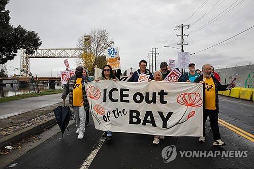 From left, ACCE members Gregory Slaughter, Grace Martinez, Anna Romero and Romero Magna hold a banner reading "ICE out of the BAY" as they march to the Home Depot during the "ICE OUT OF HOME DEPOT" protest that began from the parking lot of Guadalajara restaurant to the Home Depot in Oakland, Calif., on Saturday, Dec. 20, 2025. (Yalonda M. James/San Francisco Chronicle via AP) MANDATORY CREDIT: PHOTOGRAPHER AND SAN FRANCISCO CHRONICLE; SAN JOSE MERCURY NEWS OUT; EAST BAY TIMES OUT; MARIN INDEPENDENT JOURNAL OUT; SAN FRANCISCO EXAMINER OUT