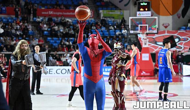 그렇게 SK가 히어로 슈트를 입었다. 20일 잠실학생체육관에서 열린 서울 SK와 서울 삼성의 3라운드 맞대결은 ‘마블 매치(MARVEL MATCH)’라는 이름처럼 색다른 온도에서 출발했다. KBL과 월트디즈니 컴퍼니 코리아가 손을 잡은 협업이었다. 첫 마블 매치는 영화와 히어로의 색감이 관중석까지 번졌다.