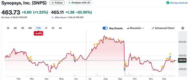 시놉시스는 중국 시장 부진 등으로 2025 회계연도 3분기(5~7월) 실적이 시장 기대에 미치지 못하며 주가가 떨어졌으나 최근 상승 전환했다. 지난 19일(현지시간) 기준 시놉시스의 주가는 463.73달러로 이달 들어 10.94% 상승했다.