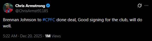 보도에 따르면 크리스털 팰리스와 토트넘에서 모두 활약했던 크리스 암스트롱은 자신의 SNS를 통해"브레넌 존슨의 크리스털 팰리스 이적은 사실상 완료된 딜이다. 클럽에 아주 좋은 영입이 될 것이고, 그는 분명 잘해낼 것" 이라며 사실상 이적을 기정사실화했다.
