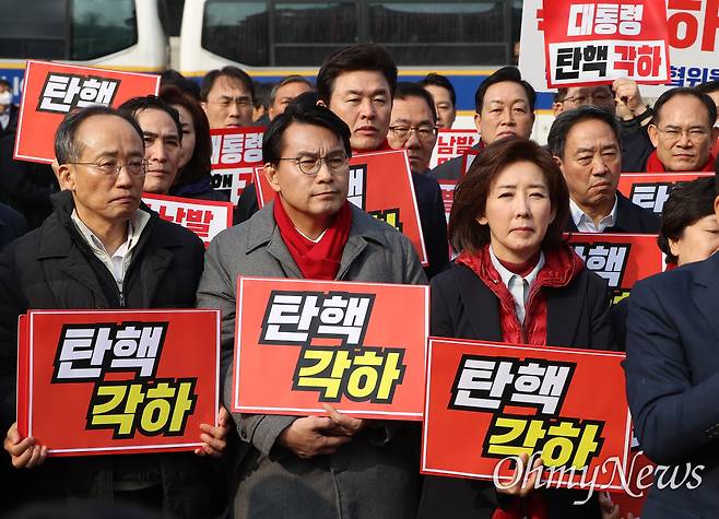 | ▲ 추경호, 윤상현, 나경원 의원 등 국민의힘 의원들이 지난 3월 21일 오전 서울 종로구 헌법재판소앞에서 윤석열 대통령 탄핵 각하를 촉구하는 기자회견을 하고 있다. 2025.3.21 |
