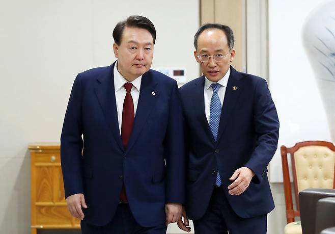 | ▲ 윤석열 대통령이 9일 서울 용산 대통령실 청사에서 열린 국무회의에 입장하며 추경호 경제부총리와 대화하고 있다. 2023.5.9 |