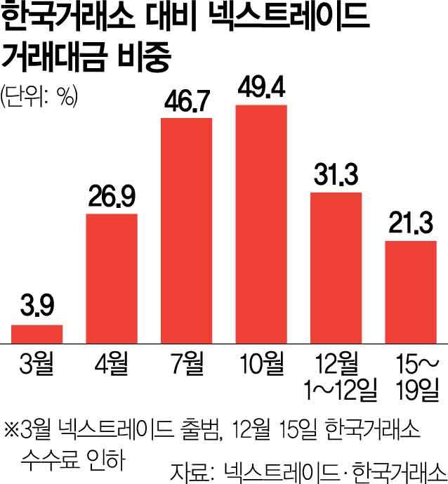 한국거래소가 내년 2월 13일까지 주식 거래 수수료 인하에 나서면서 대체거래소(ATS) 넥스트레이드의 시장 점유율이 빠르게 위축되고 있다.