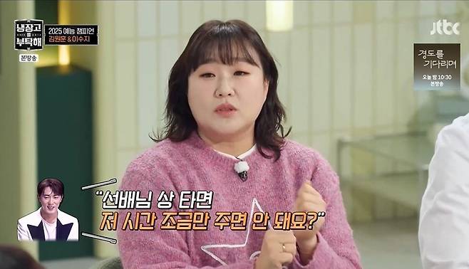 이수지는 시상식에서 소감 시간을 양보한 일화를 꺼냈다. 이수지는 "원훈 씨 뒷자리여서 어깨만 보였다. 이미 마음속으로는 상을 받았더라. 우쭐해있었는데, 상을 못 받으면서 어깨가 내려갔다. 뒤돌아서 저한테 '상 타면 저한테 시간 조금만 주면 안 되냐'고 하길래 짠해서 시간을 줬다"고 밝혔다.