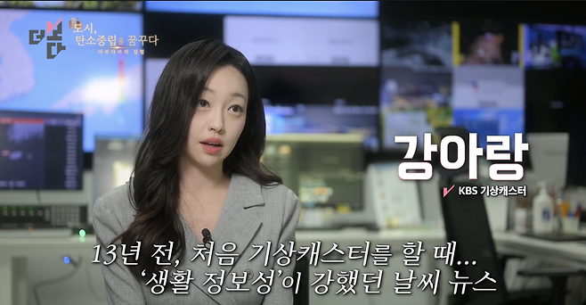 “예전에는 제가 처음 기상캐스터 시작할 때만 해도 생활 정보성이 강했기 때문에 일할 때는 이번엔 김장을 좀 일찍 해 보는 건 어떨까요? 이런 식으로 아니면 옷을 따뜻하게 입으셔야겠습니다. 이렇게 얘기를 했던 것 같은데요. 지금은 가볍고 유쾌한 생활 정보가 아니라 재난 방송을 하고 있다. ‘재난 상황에 대비하셔야겠습니다’ 이런 이야기들을 하는 날이 점점 많아지고 있다는 거를 제가 원고를 쓰면서 느끼게 되거든요.”